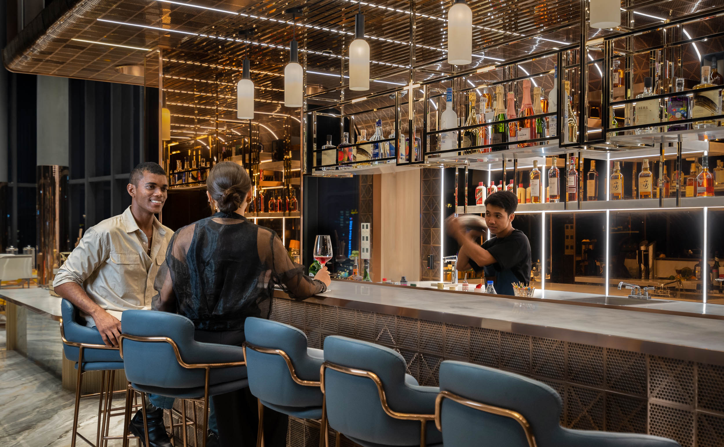 There were several challenges throughout the shoot. Photographing the restaurant at night during service required balancing mixed lighting, capturing natural activity, and maintaining the ambience without losing clarity. Another challenge was lighting the models across different locations throughout the property—each with its own colour temperature, reflective surfaces, and spatial limitations. Fortunately, with extensive experience in lighting people in varied environments, we were able to achieve consistent, flattering results that matched the hotel’s aesthetic.