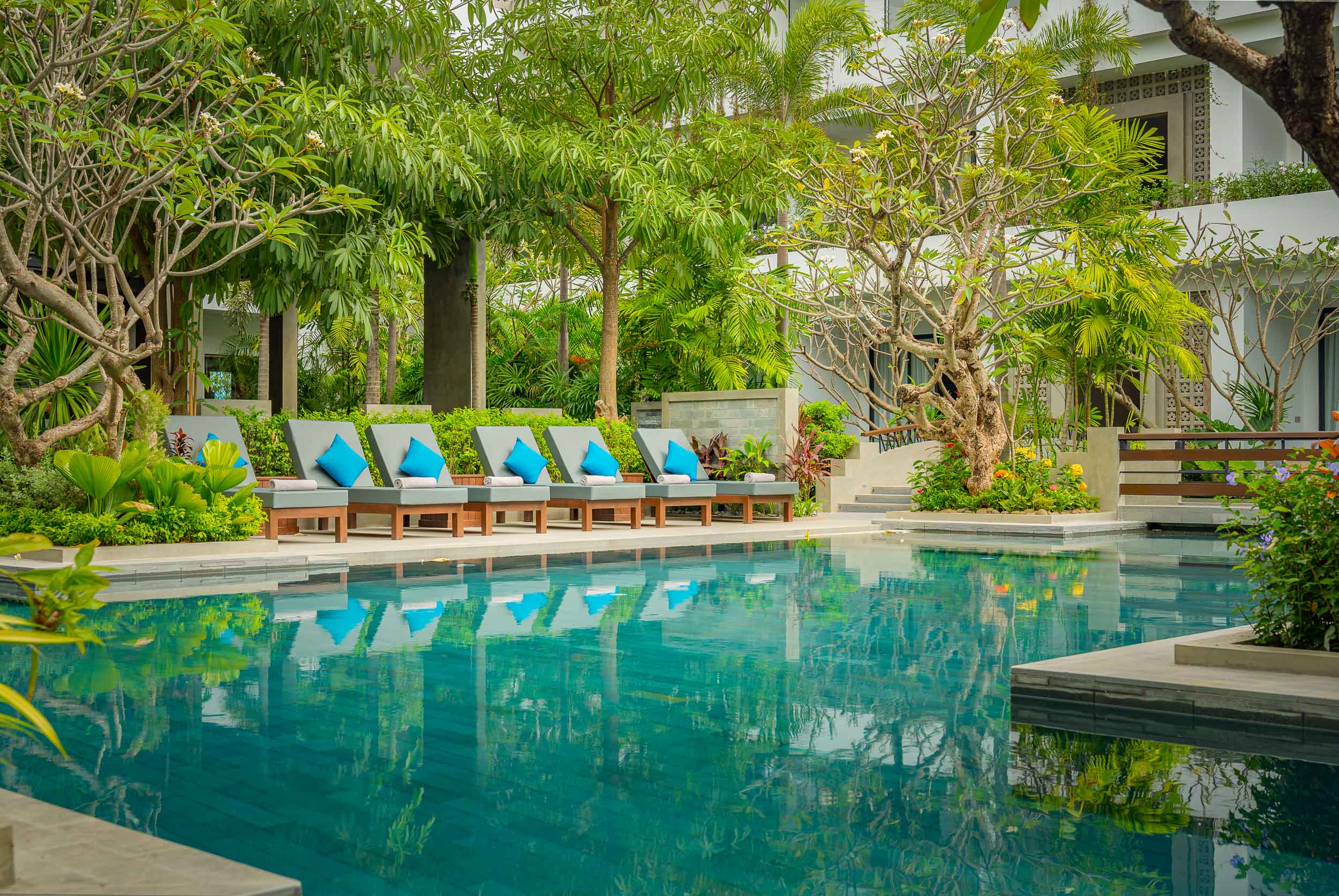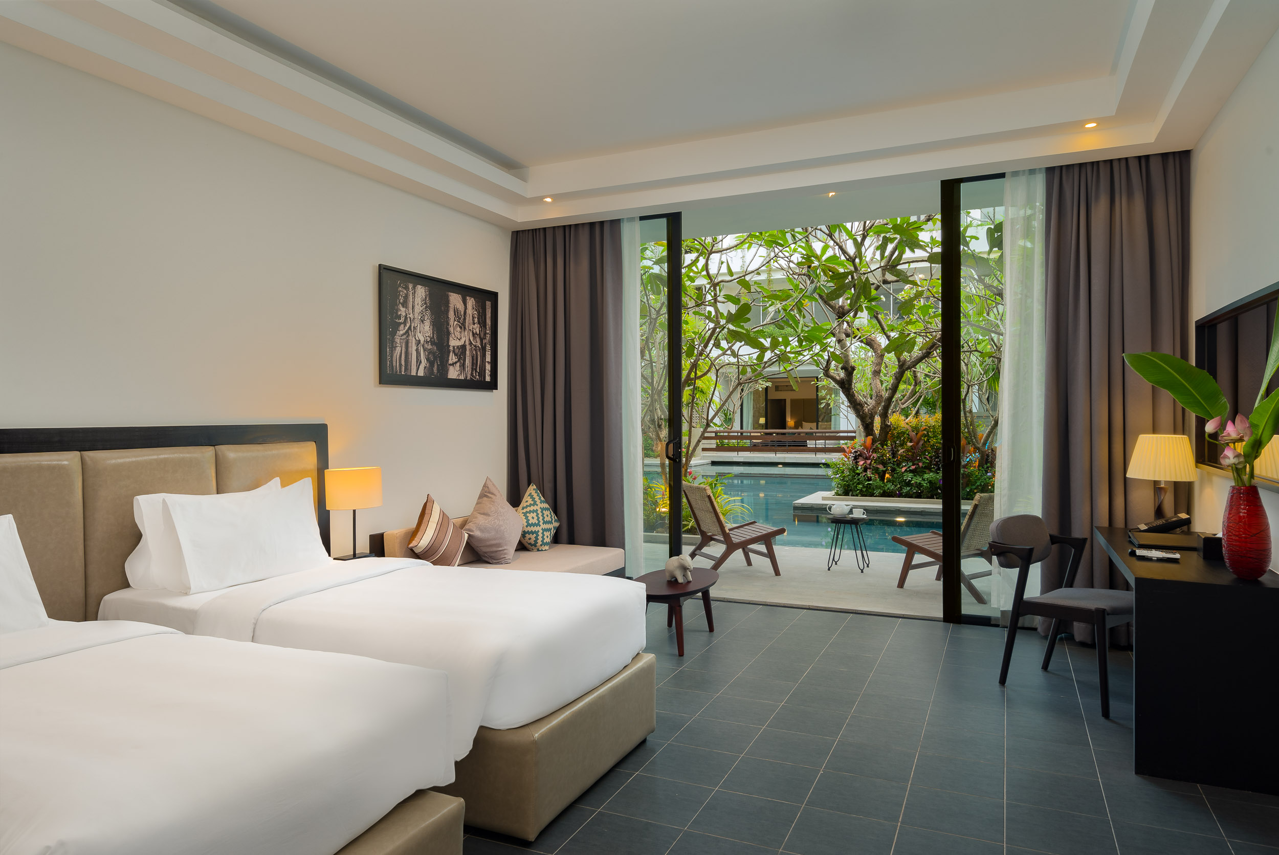 This hotel photography project at Eightfold Urban Resort in Siem Reap focused on capturing a modern boutique property that combines contemporary design with Khmer influences, set within a calm, garden-focused environment.